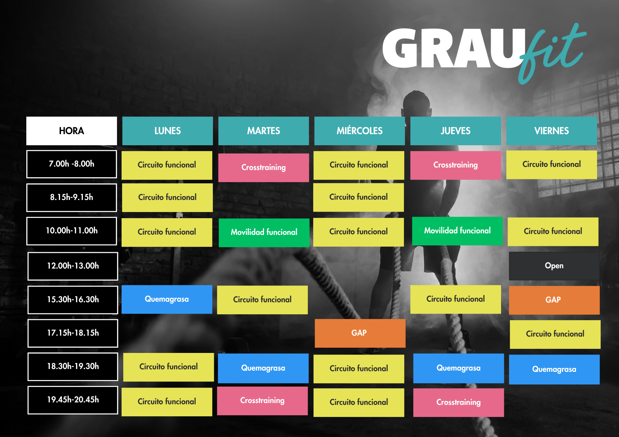 15.30h – 16.30h | Quemagrasa | Circuito funcional | Circuito funcional | GAP | |