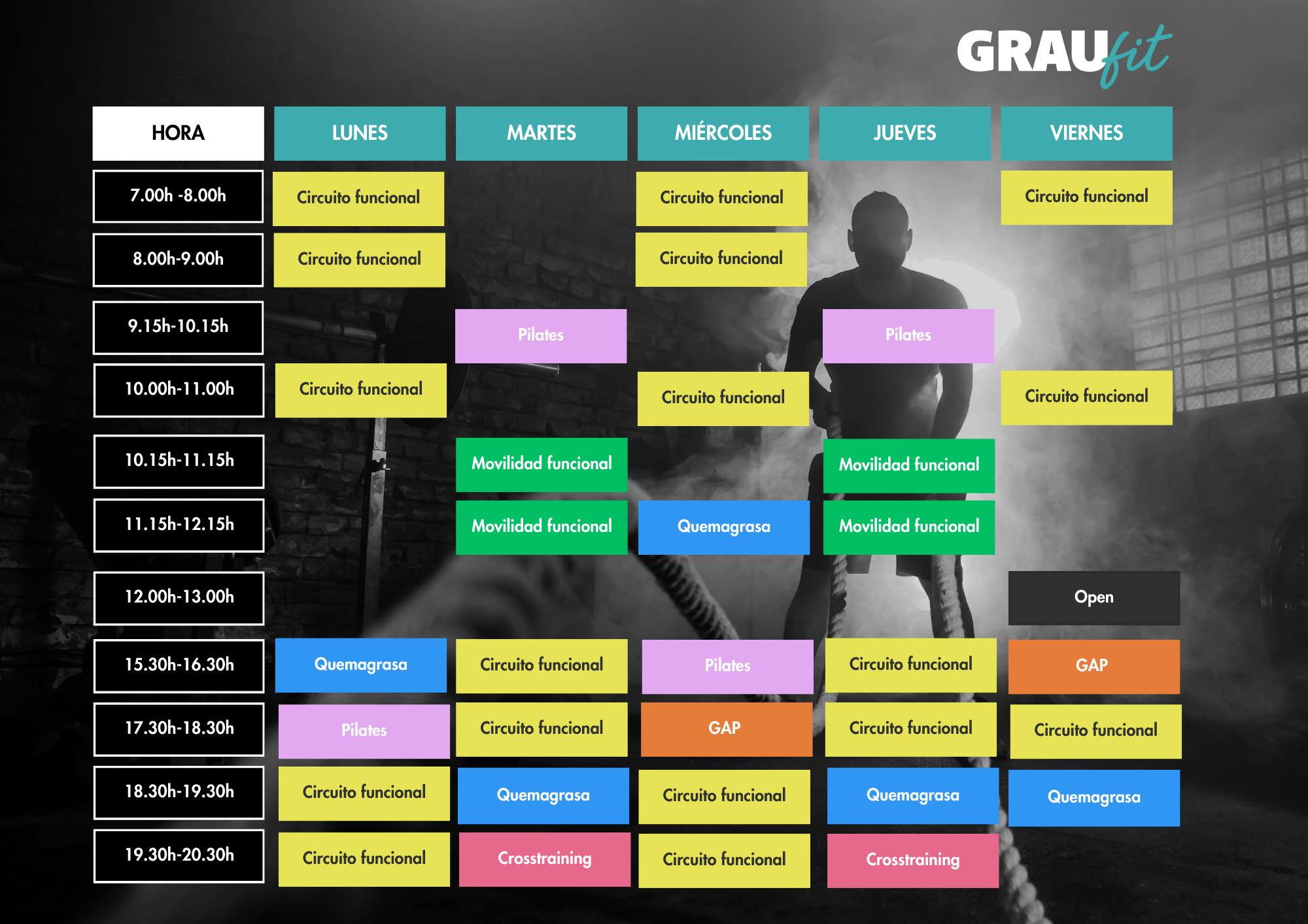 | 15.30h – 16.30h | Quemagrasa | Circuito funcional | Pilates | Circuito funcional | GAP |